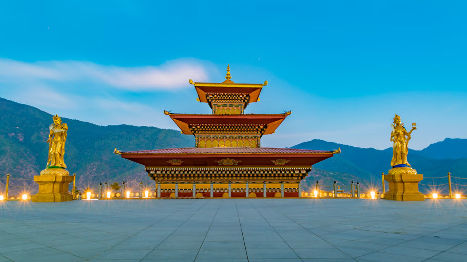 Today, you will be exploring the best attractions in the capital city of Bhutan. Visit the National Memorial Chorten, built in the honour of the late King Jigme Dorji Wangchuck. Continue to the largest Buddha Statue and enjoy beautiful views of the Thimphu Valley. Next, continue to the Motithang Takin Preserve and the Tashichho Dzong. Later, visit the Simtokha Dzong and the beautiful Handicrafts Emporium. Afterwards you'll be driven back to your hotel for an overnight stay.